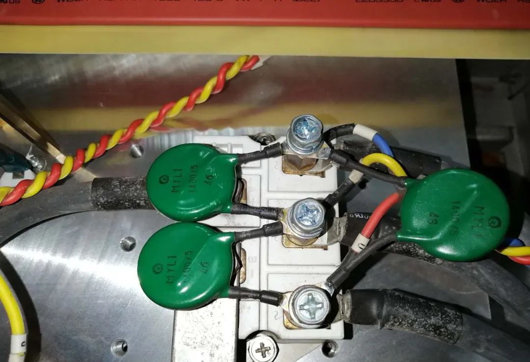 4.壓敏電阻 壓敏電阻是一種具有非線性伏安特性的電阻器元件,當(dāng)加在壓敏電阻上的電壓低于它的閾值時,流過它的電流極小,它相當(dāng)于一個阻值無窮大的電阻;當(dāng)加在壓敏電阻上的電壓超過它的閾值時,流過它的電流激增,它相當(dāng)于阻值無窮小的電阻,利用壓敏電阻的特性,用于在電路承受過電壓時進行電壓鉗位,吸收多余的電流以保護敏感器件和后續(xù)電路。我個人理解是當(dāng)電路中的過電壓使壓敏電阻導(dǎo)通后,功率單元的輸入側(cè)相間短路,熔斷器熔斷,保護后續(xù)電氣回路。檢測時使用萬用表電阻檔位測量整流橋并聯(lián)壓敏電阻。