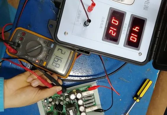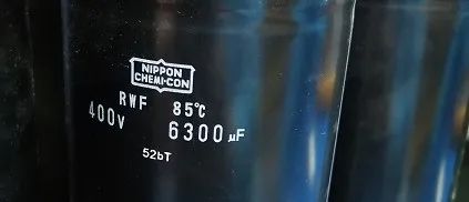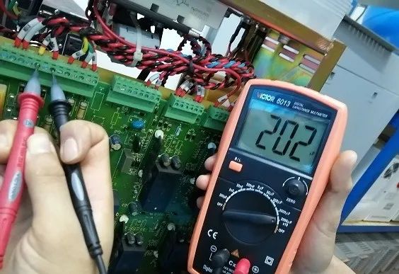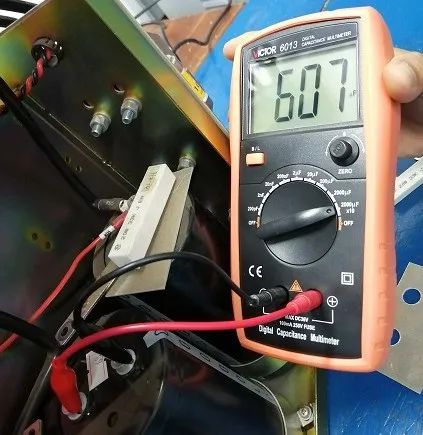 額定容量是6300μF,測得6070μF,只要不低于額定容量的80%就是合格的,注意電解電容是有極性的,有白色圖標(biāo)的一側(cè)為負。一個功率單元濾波回路是三個電容器串接而成的,串聯(lián)電容總?cè)萘康扔诿總€電容器容量的倒數(shù)和的倒數(shù)。所以我們測總?cè)萘渴?020μF。
