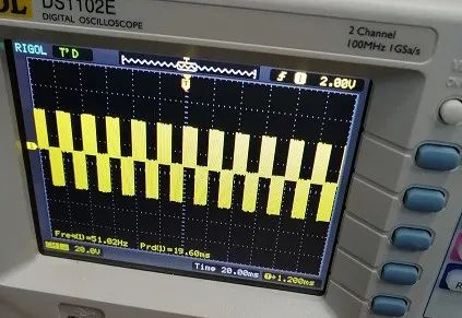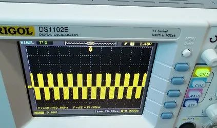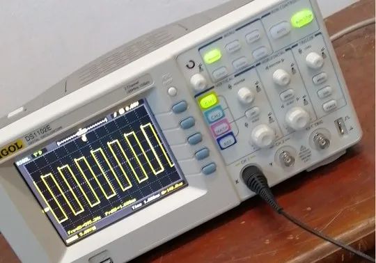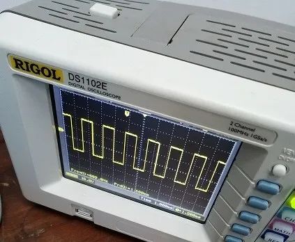 調(diào)整示波器水平方向旋鈕,波形壓縮之后變成下圖的標(biāo)準(zhǔn)方波。