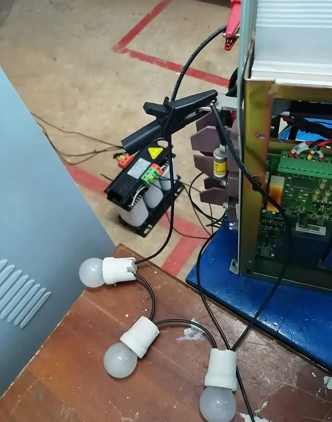 先給功率單元加一個交流30V的低電壓。接線順序是電源+調(diào)壓器+變壓器+功率單元,維修工裝給定電壓輸入50%,測量功率單元輸出電壓交流15V,然后測量其波形,正常的應(yīng)該是規(guī)律的方波。