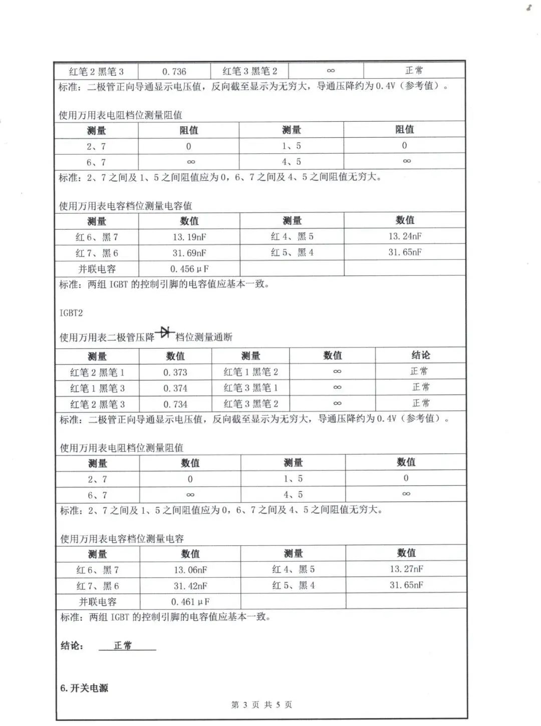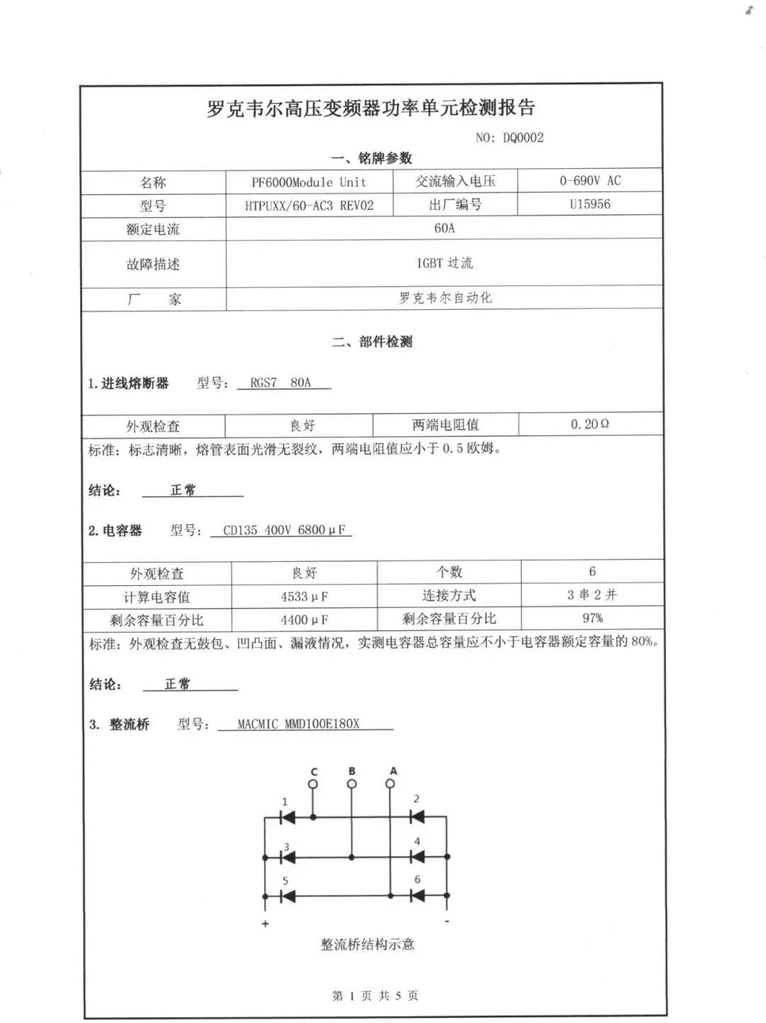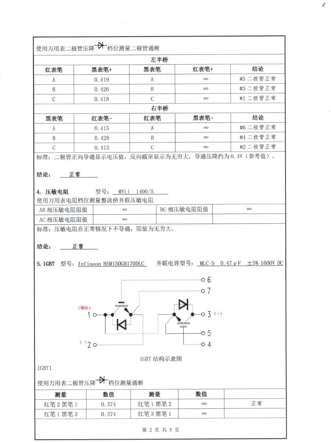 5. IGBT模塊 AB變頻器功率單元內(nèi)都是使用的德國英飛凌的IGBT,IGBT的英文全稱是Insulated Gate Bipolar Transistor,中文名稱是絕緣柵雙極型晶體管。具體檢測步驟及標(biāo)準(zhǔn)詳見檢測報告單。