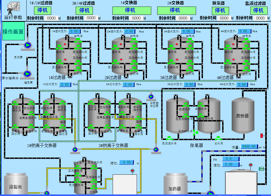 5、在主畫面中,可以讓你直觀的了解到各個(gè)工位的閥門、電機(jī)的工作狀態(tài)和在當(dāng)前工位下,管道水流的方向。
