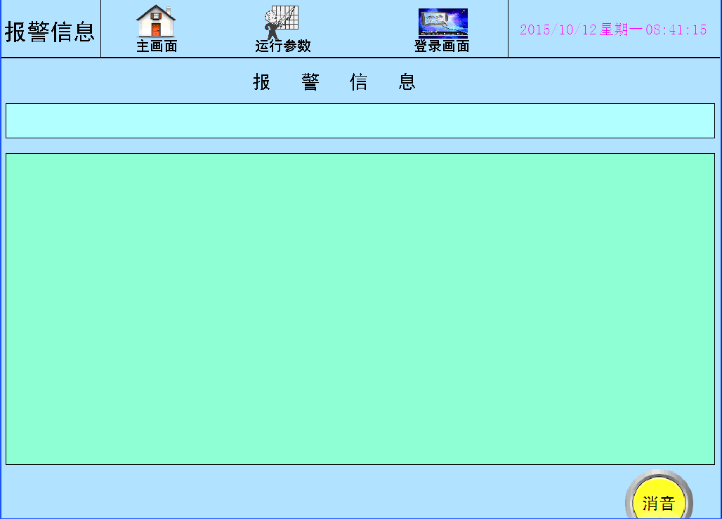 10、點(diǎn)擊“報(bào)警畫面”時(shí),彈出框(圖8)。當(dāng)系統(tǒng)運(yùn)行時(shí)出現(xiàn)報(bào)警,該報(bào)警會被顯示在此畫面中。報(bào)警信息會以兩種形式出現(xiàn)在畫面中,(1、報(bào)警走馬燈2、報(bào)警列表),兩種方式所顯示的報(bào)警信息具有相同性。